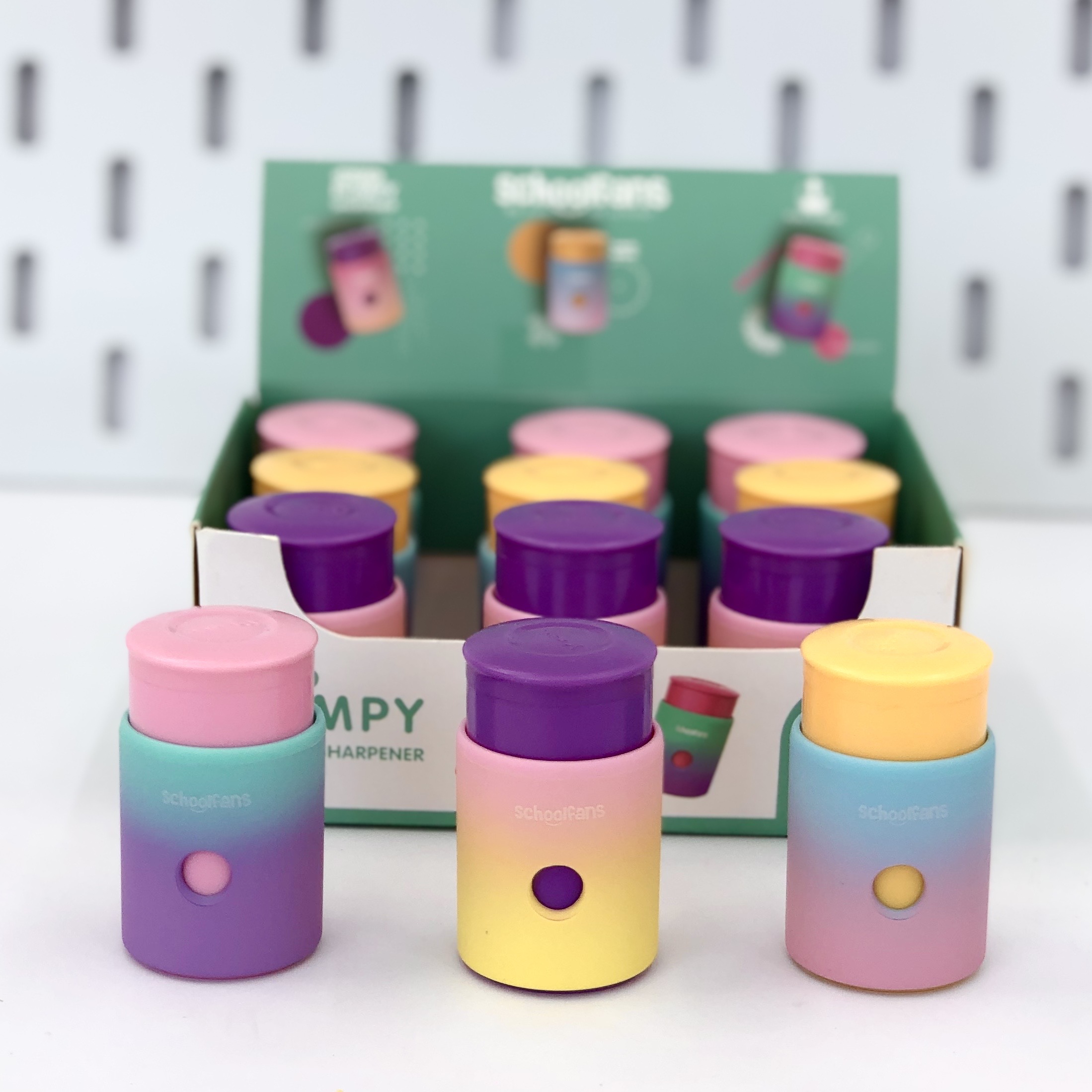 مداد تراشهای برند Schoolfans با طراحی متنوع و کیفیت بالا، مناسب برای دانشآموزانو هنرمندان.